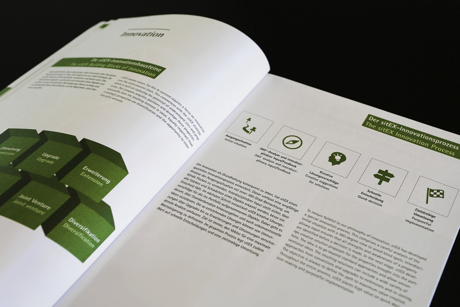 Stephan Wegelin gestaltete für sitEX einen Naming-Prozess mit verschiedenen strategischen Suchrichtungen wie zum Beispiel «Swissness», «Finanzielles Wachstum», «Erfolg» oder «Börsenkotierung». Danach folgte ein systematisches Brainstorming für denkbare Namen innerhalb der verschiedenen Suchrichtungen. Konkrete Ideen auf der Shortlist wurden bezüglich Schutz und Domainfähigkeit sowie Firmierung geprüft. Den definitiv gewählten Namen inklusive Claim setzte Stephan Wegelin in einem konsequenten Prozess um: Logoentwürfe, Finalisierung Logo, Aufbau von Bildwelten und Farbcode, Umsetzung von Tonalität, Grafik, Layout und Adaption auf Kommunikationsinstrumente wie Website, Briefschaften, Power-Point-Präsentation oder Geschäftsberichte.